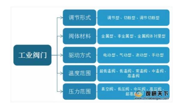 1、工業(yè)閥門(mén)是一種工業(yè)管路上控制介質(zhì)流動(dòng)的重要附件,可用于控制空氣、水、蒸汽、各種腐蝕性介質(zhì)、泥漿、油品、液態(tài)金屬和放射性介質(zhì)等各種類型流體的流動(dòng)。工業(yè)閥門(mén)可以根據(jù)不同的標(biāo)準(zhǔn)來(lái)分類,根據(jù)調(diào)節(jié)形式可分為調(diào)節(jié)型、切斷型、調(diào)節(jié)切斷型;根據(jù)閥體材料可分為金屬型、非金屬型、金屬閥體襯里型;根據(jù)驅(qū)動(dòng)方式可分為電動(dòng)型、氣動(dòng)型、液動(dòng)型、手動(dòng)型;根據(jù)溫度范圍可分為超低溫閥、低溫閥、常溫閥、中溫閥、高溫閥;根據(jù)壓力范圍可分為真空閥、低壓閥、中壓閥、高壓閥、超高壓閥。