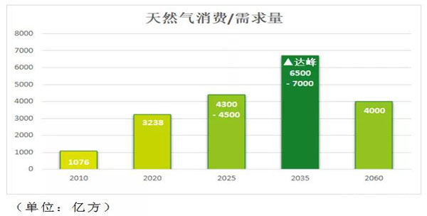 過去十年,國內(nèi)天然氣消費(fèi)量從2010年的1076億方,增長到2020年的3238億方,占能源消費(fèi)總量比例連年遞增。據(jù)中國石油規(guī)劃總院預(yù)測,2025年全國天然氣需求約在4300-4500億方;2035年天然氣需求達(dá)峰,約6500-7000億方,隨后需求下降,最終在2060年降為4000億左右。